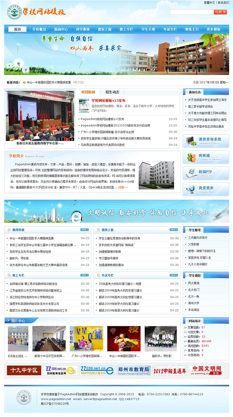 个人主页网站系统源代码–小计天空pageadmin学校网站管理系统是一款支持多分站、多语种,集成内容发布、信息发布、自定义表单、自定义模型、会员系统、业务管理等功能于一体的网站管理系统,用户可以免费下载使用,无任何功能和时间的限制,系统于2008年正式发布,目前全国用户已经超过100万以上,被广泛用于中小学及大专院校网站搭建,客户包括北大、清华、浙大学等国内一流的学府。