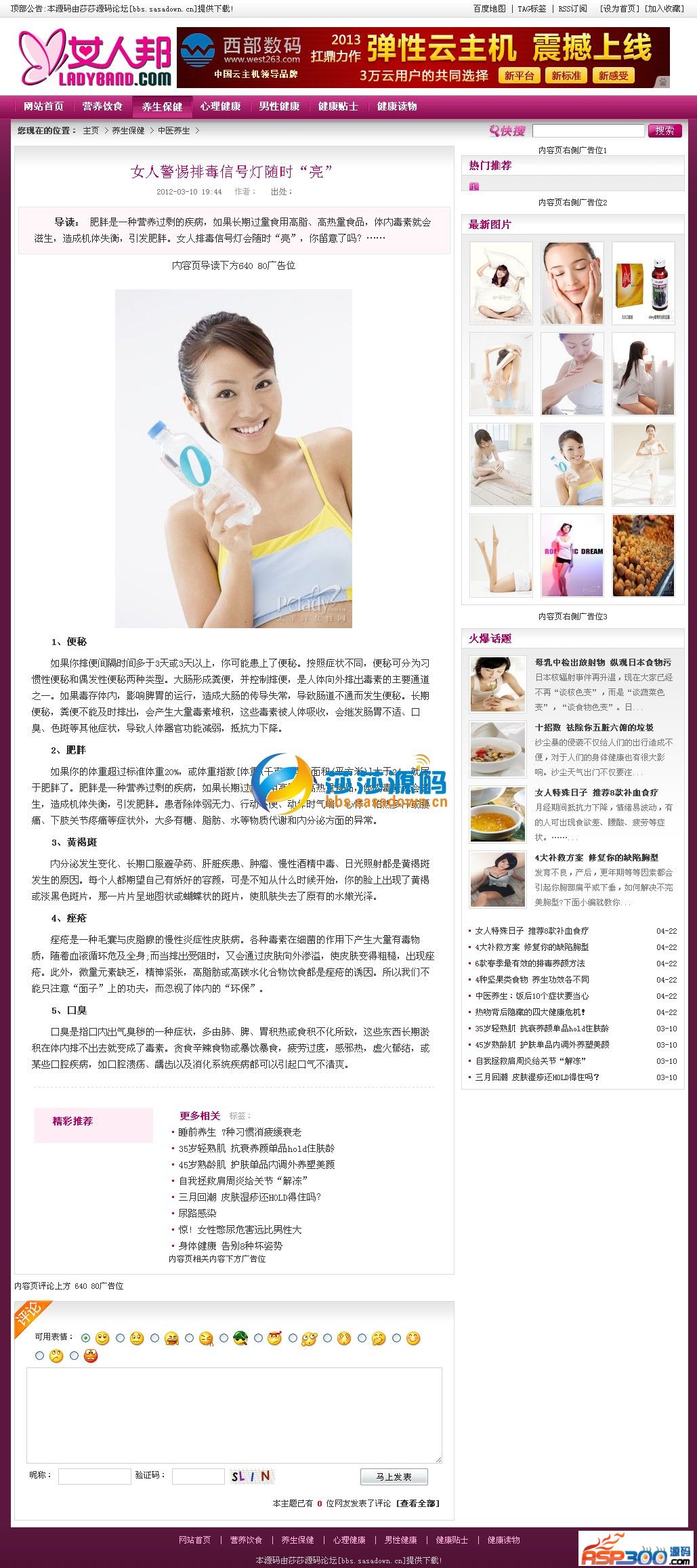 《女人帮》女性健康资讯门户网站程序采用织梦DEDECMS V5.7内核二次的,模版设计大气、整洁、漂亮,整体采用粉红色突出女性主题,全站可生成HTML,方便搜索引擎收录。程序运行环境需支持PHP+MYSQL