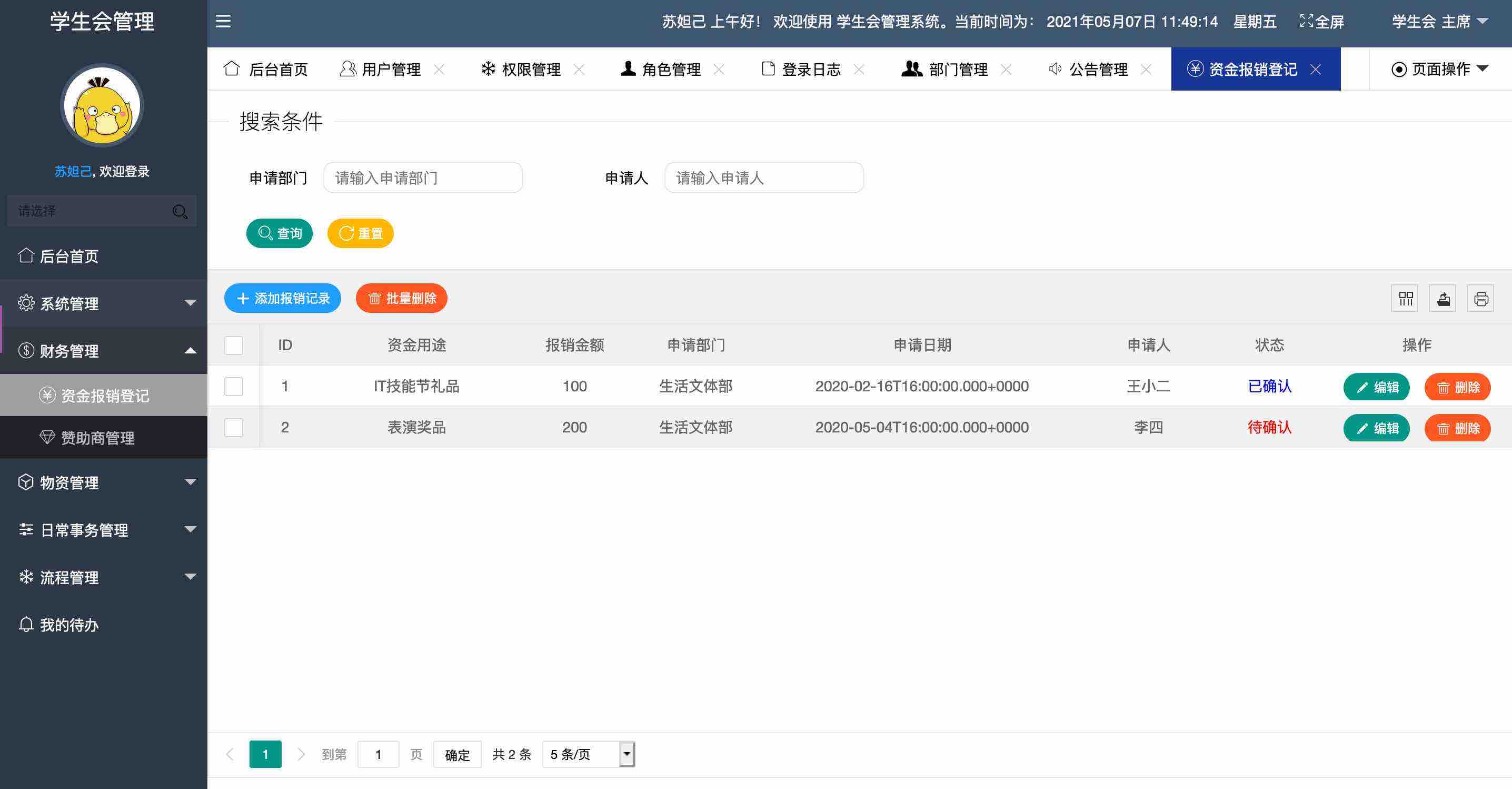 财务管理:资金报销登记、赞助商管理