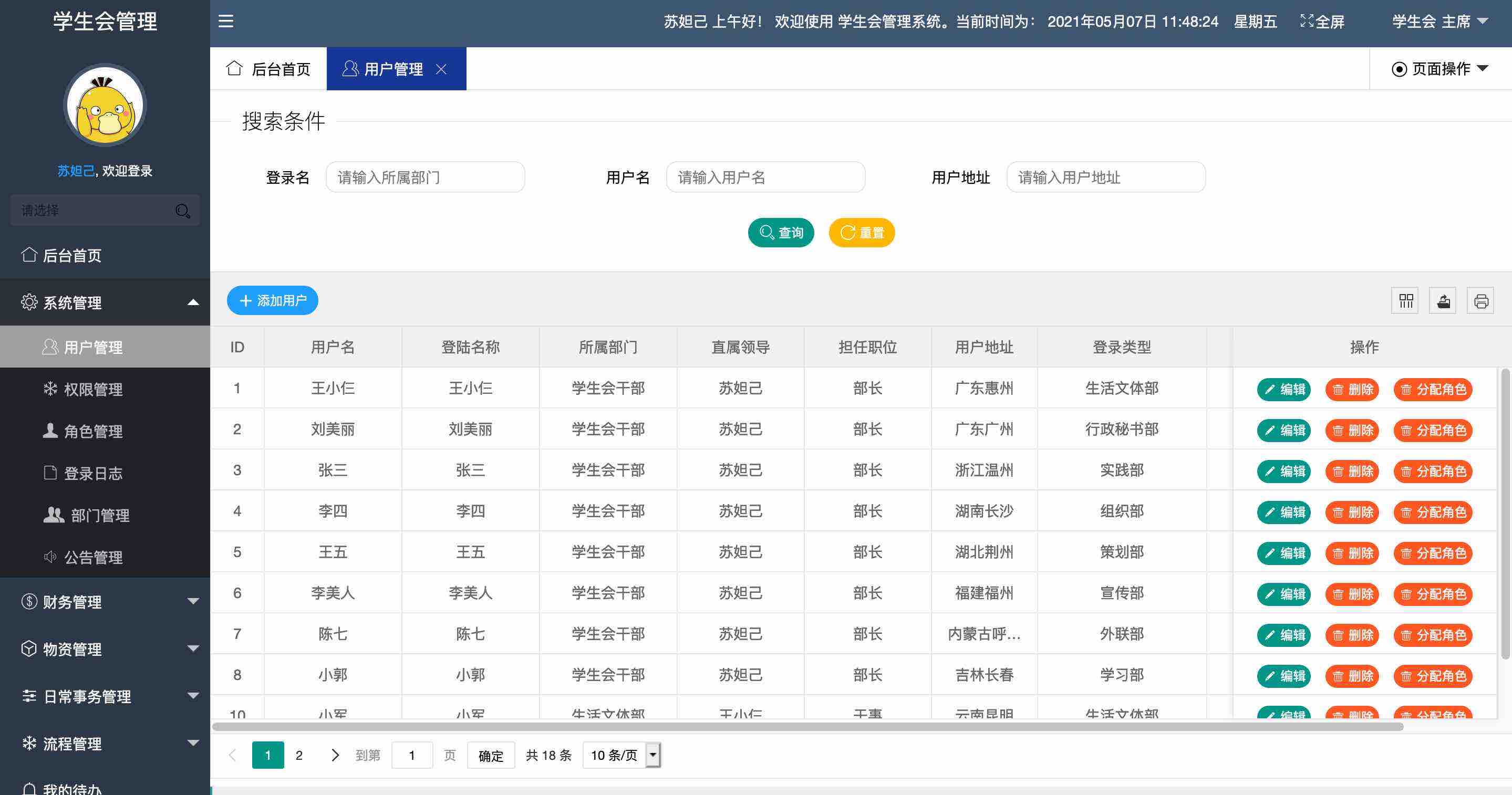 外联部部长、策划部部长、学生会干事等角色,不同的角色登录系统,看到的功能菜单不一样。