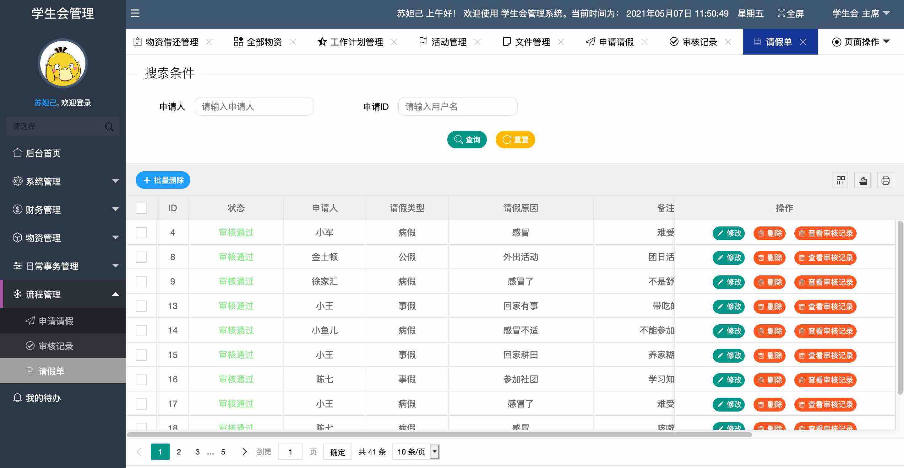 流程管理: 申请请假、审核记录、请假单