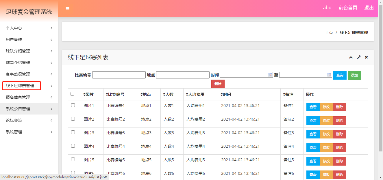 、线下足球赛管理、报名信息管理、系统公告管理、论坛交流