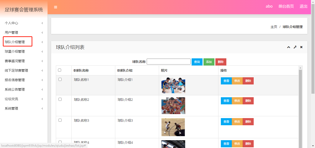 个人中心、用户管理、球队介绍管理、球星介绍管理、赛事盛况管理