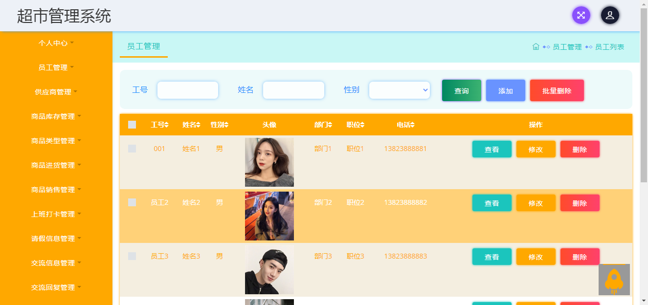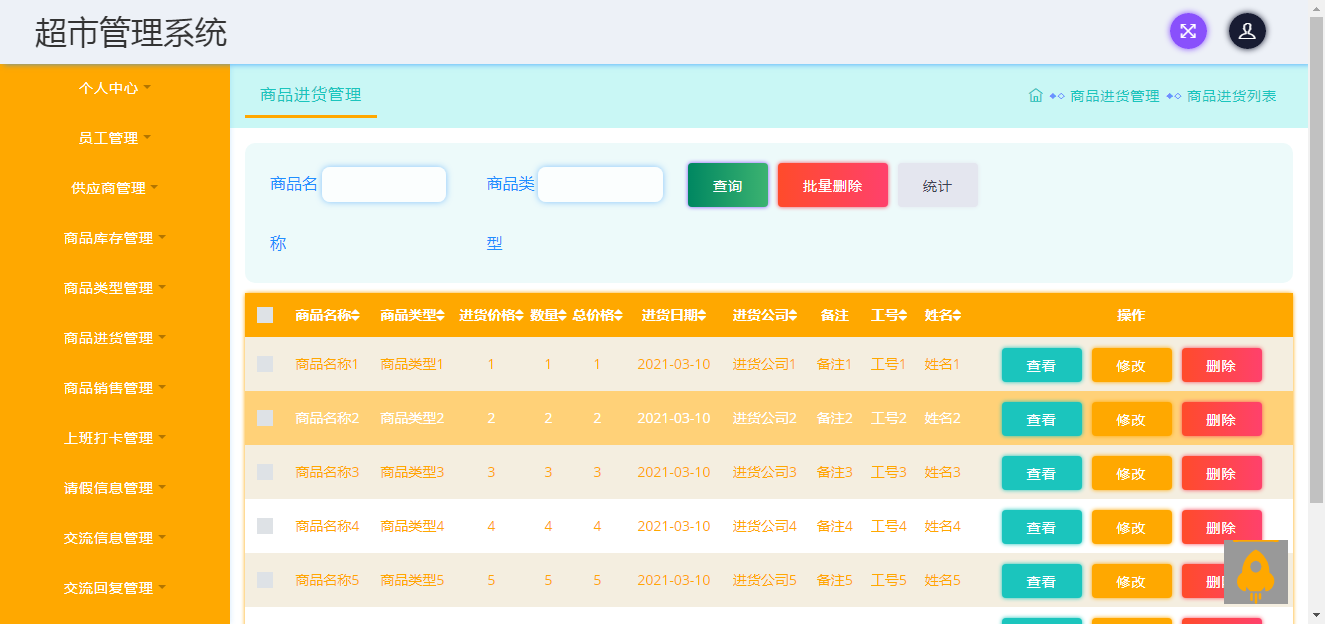 员工管理、供应商管理、商品库存管理(只有增删改,出入库由员工负责)、商品类型管理