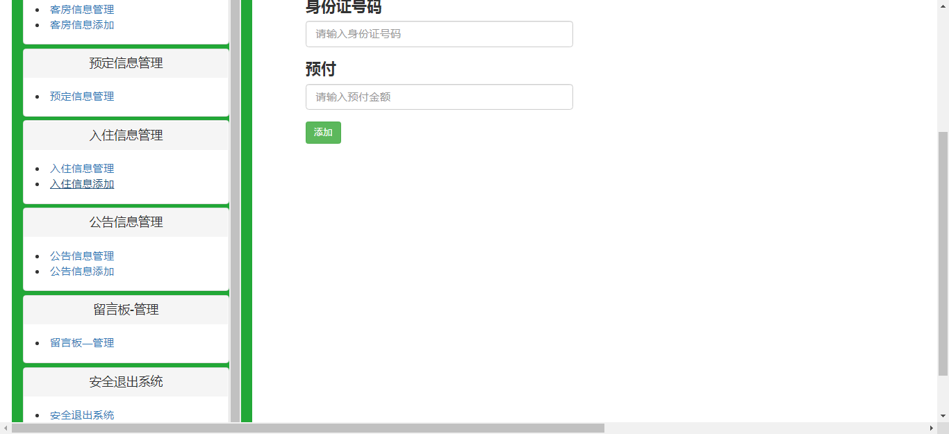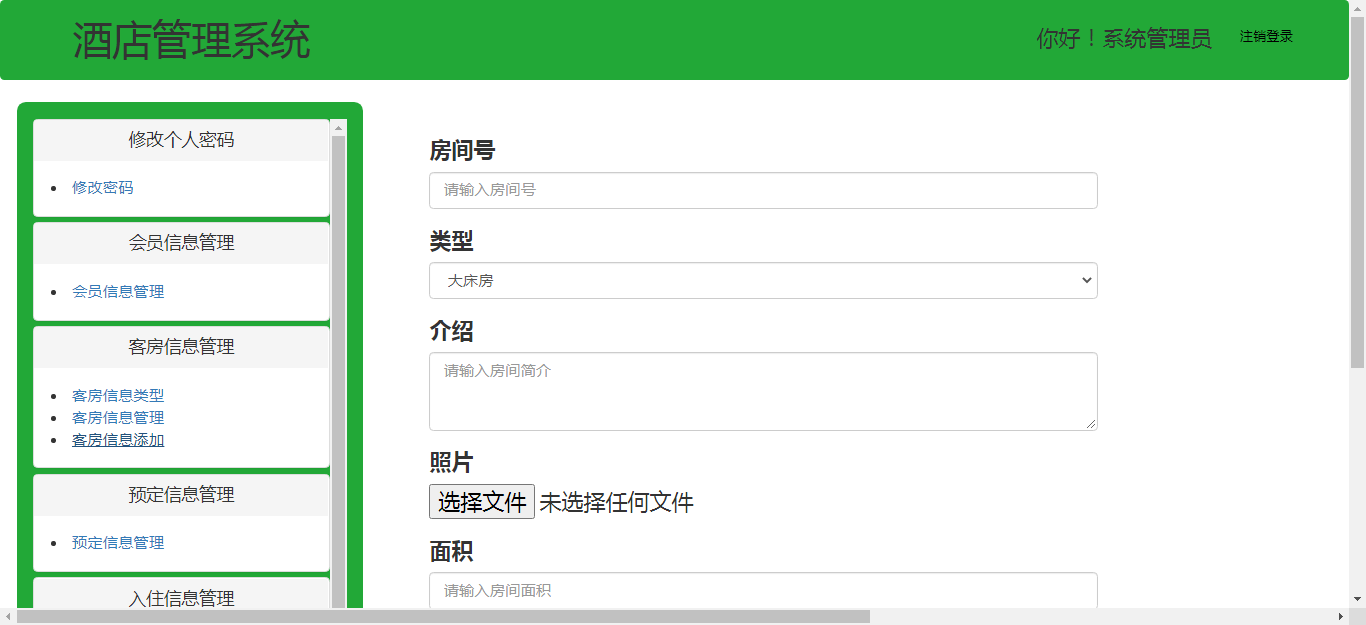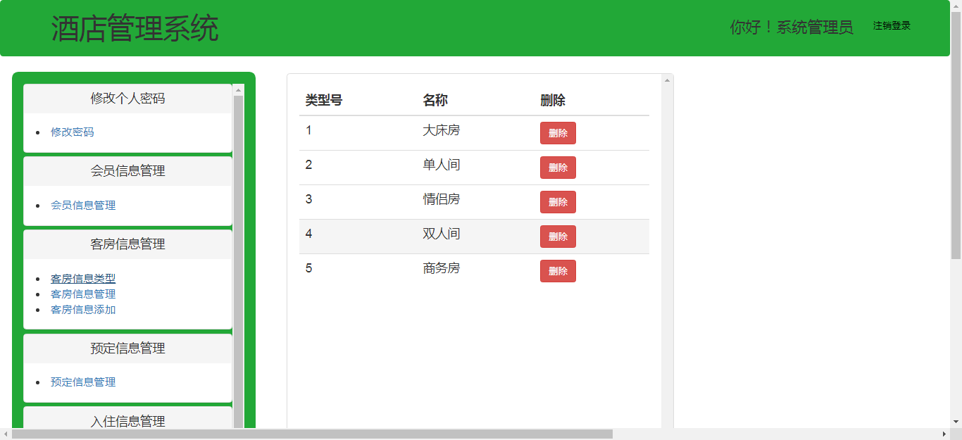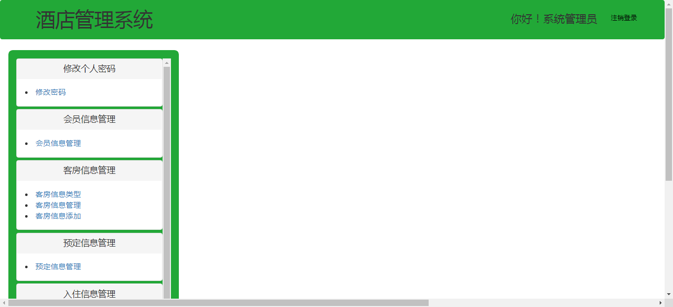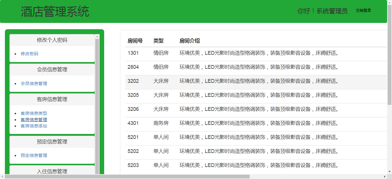 系统包含:会员信息管理、客房信息类型、客房信息管理、客房信息添加、预定信息管理、入住信息管理、