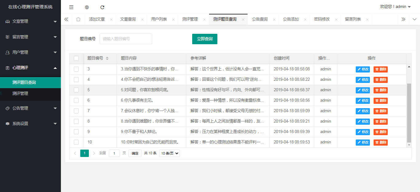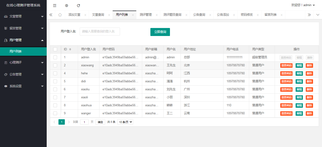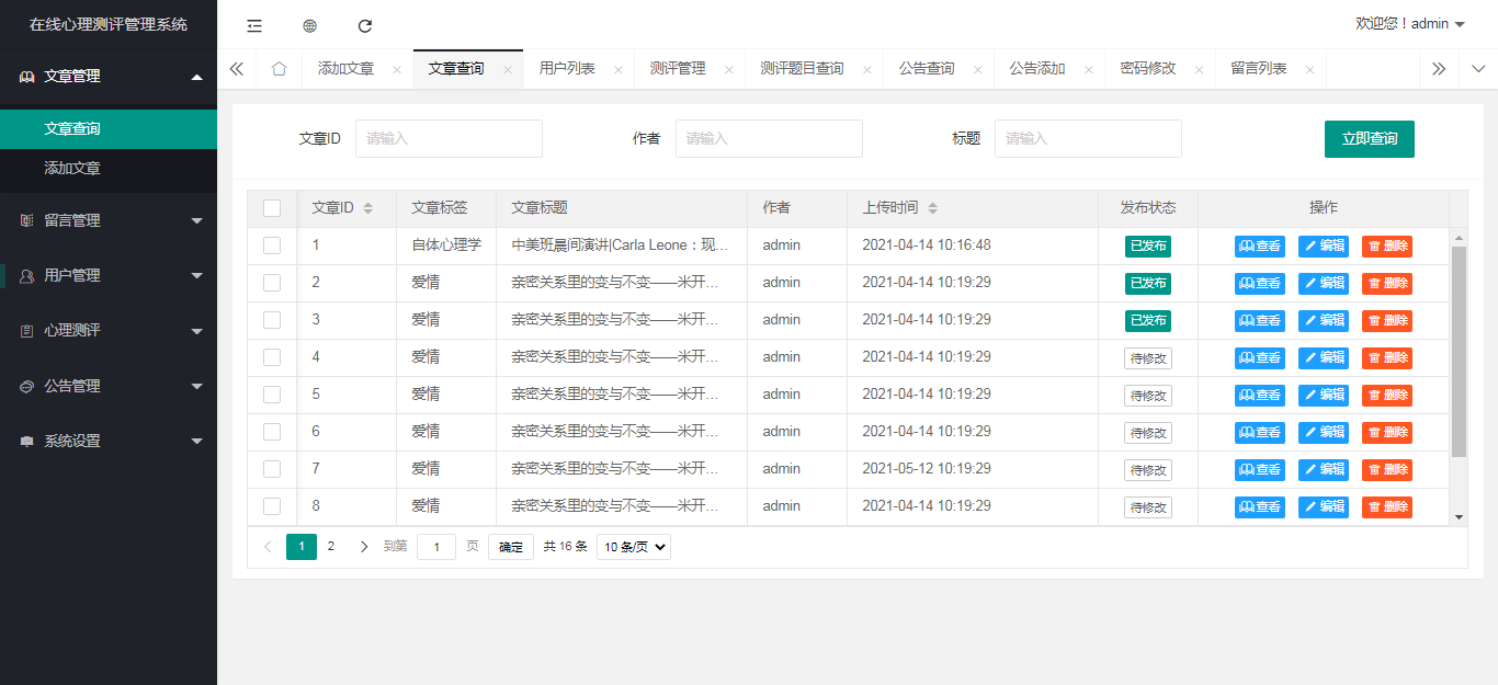 后端包含:文章管理、留言管理、用户管理、心理测评、公告管理、系统设置等