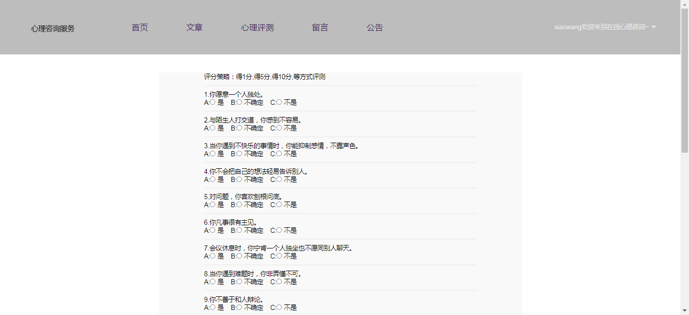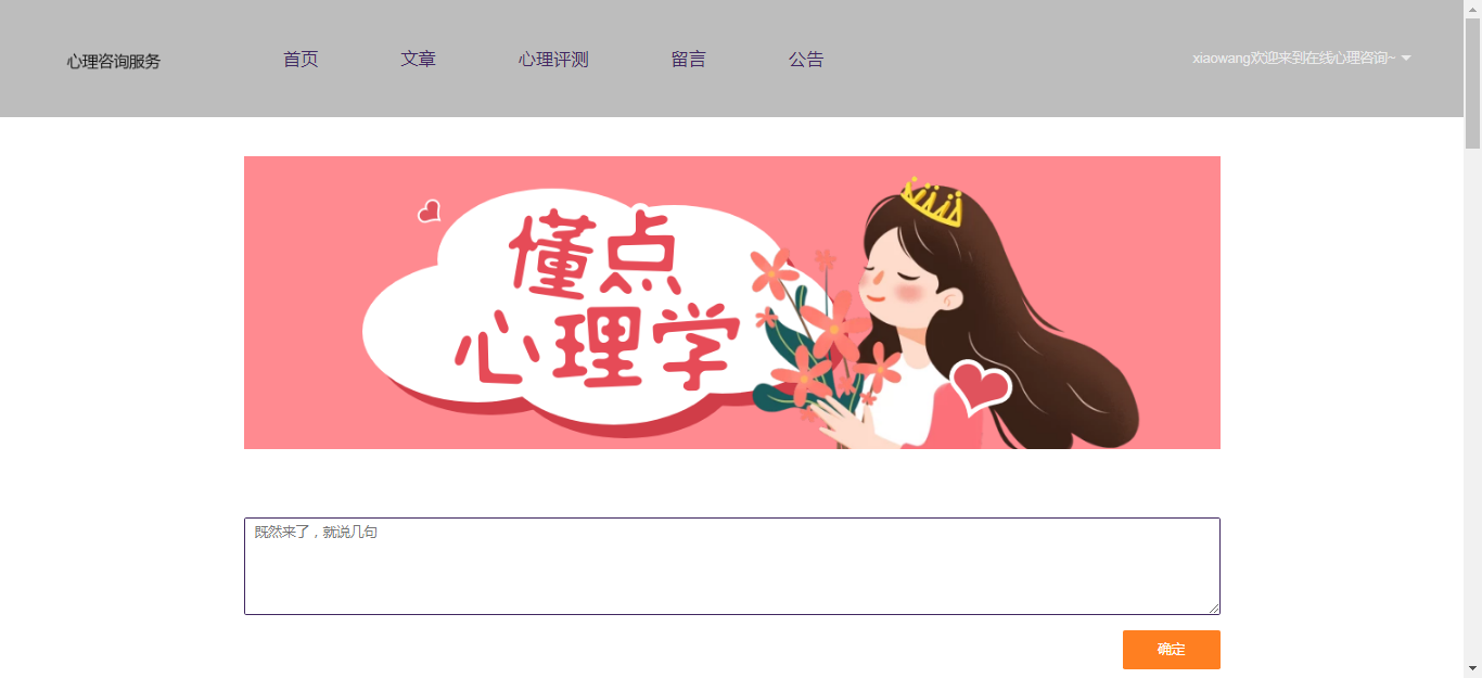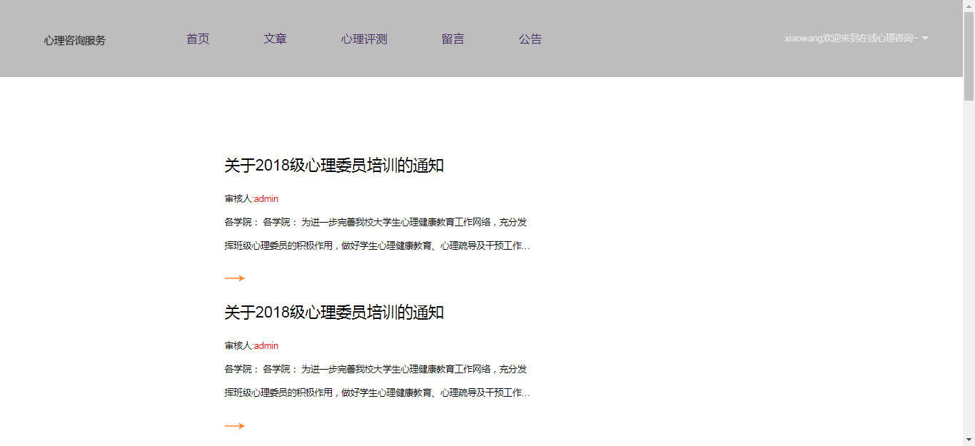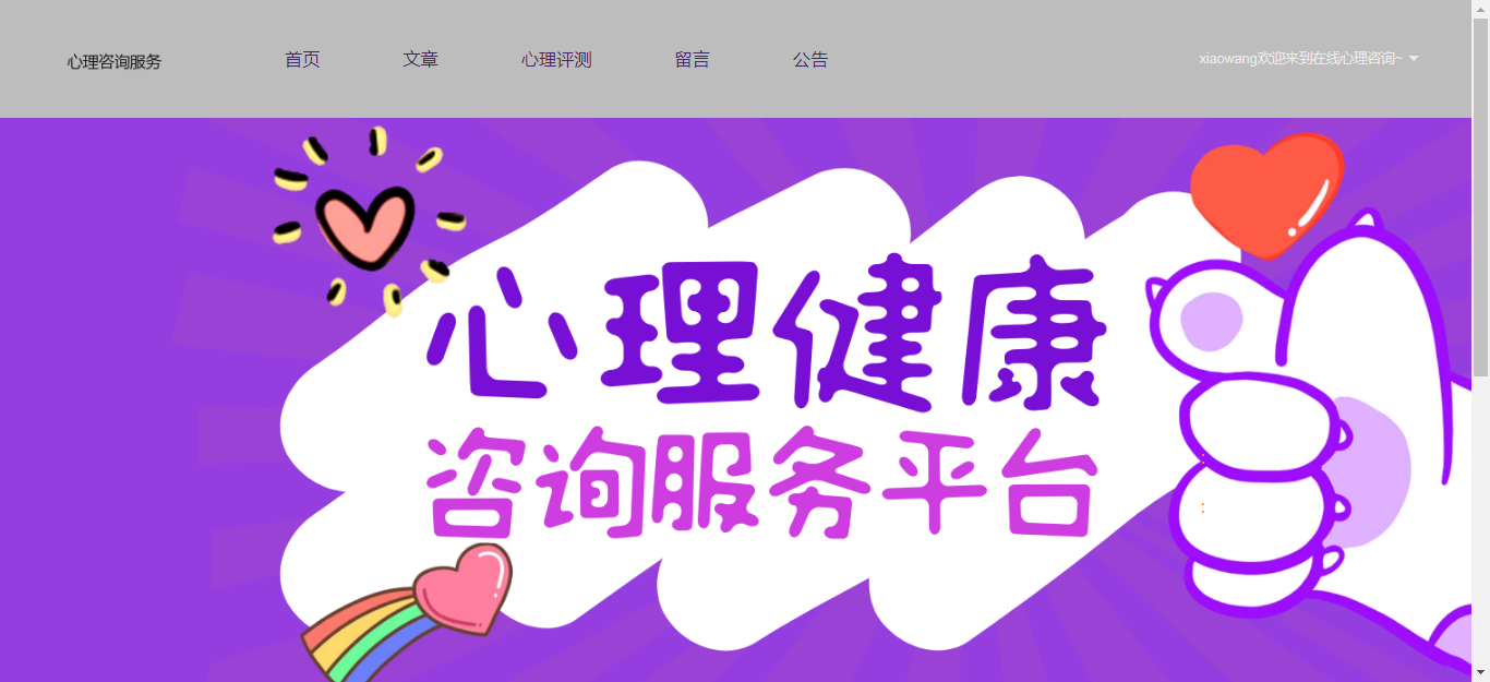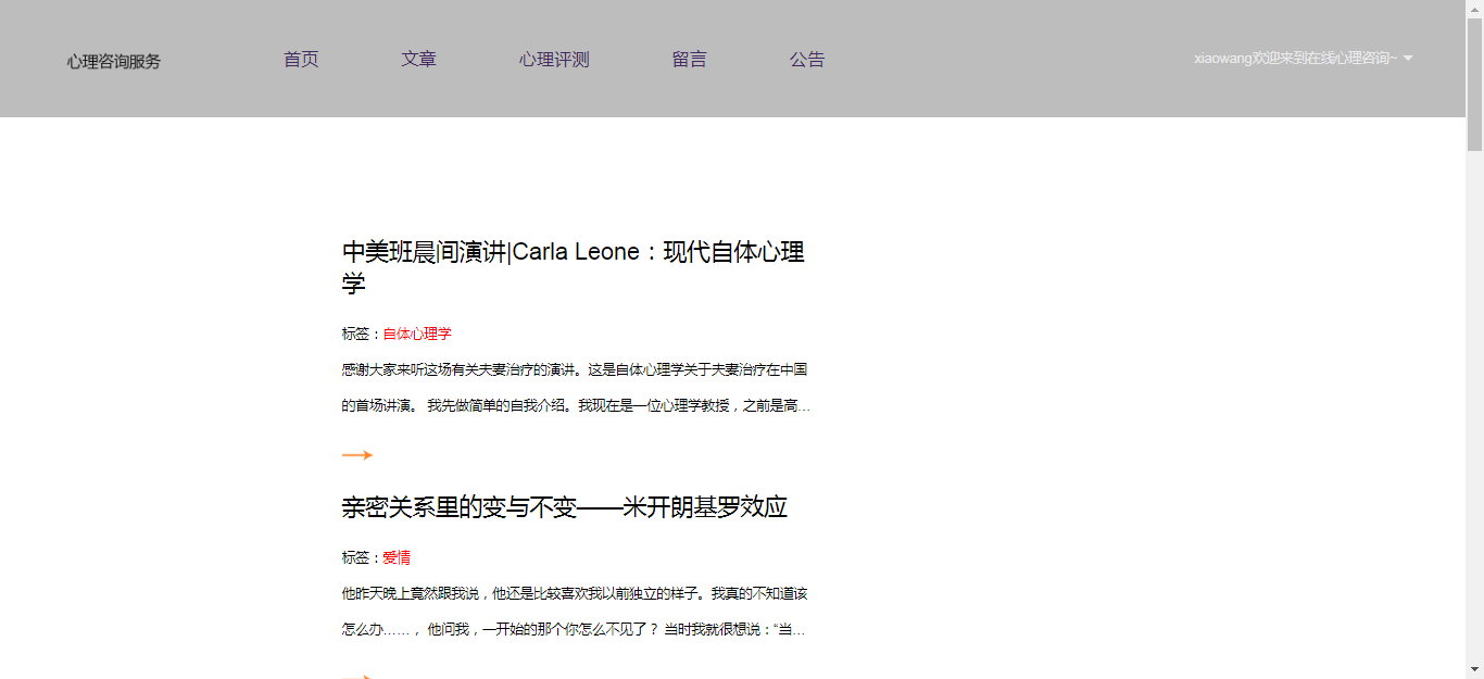 前端包含:首页、文章展示、心理测评、留言、公告。