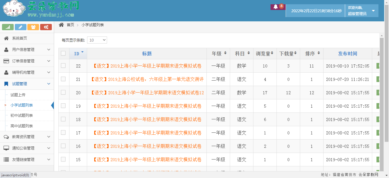 试题管理、教育资讯管理、通知公告管理、友情链接管理