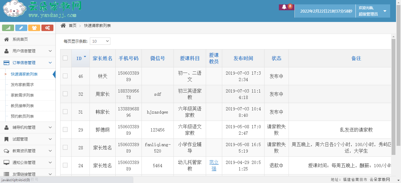 管理员主要负责后台维护,包含以下功能:系统首页、用户信息管理、订单信息管理、辅导机构管理、