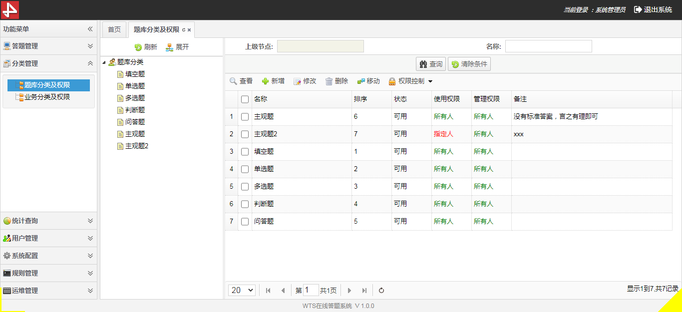 支持单选题、多选题、填空题、问答题、判断题、附件题、材料题、视频题、音频题。