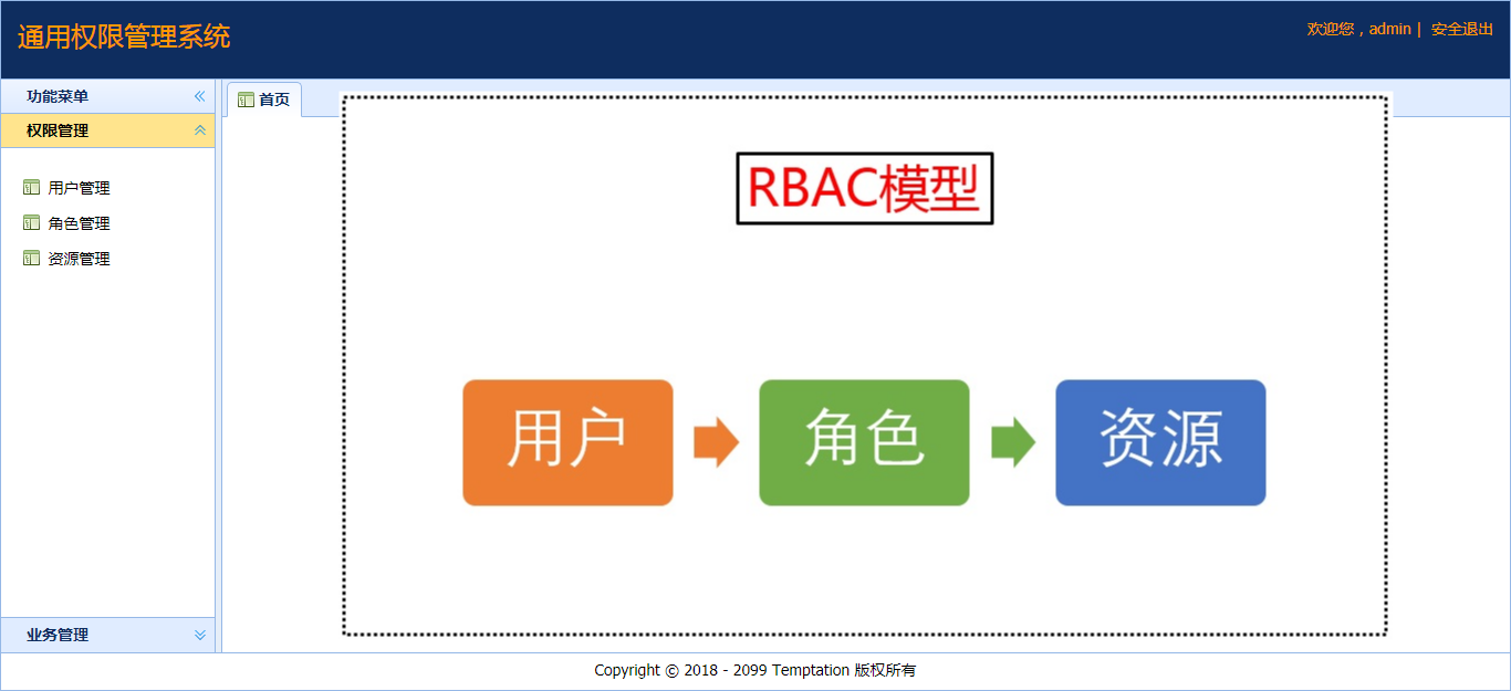 设计思路源于经典的RBAC模型,即:用户通过角色操作资源。