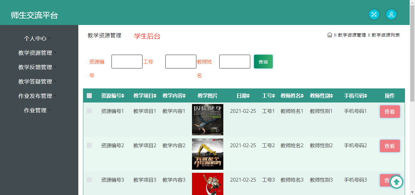 个人中心、学生信息管理、教师信息管理、教学资源管理