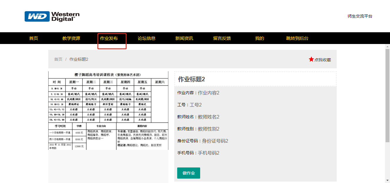 学生可以浏览前台查看教学资源、申请做作业、论坛信息、新闻资讯等信息查看。