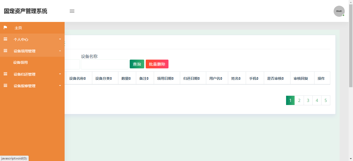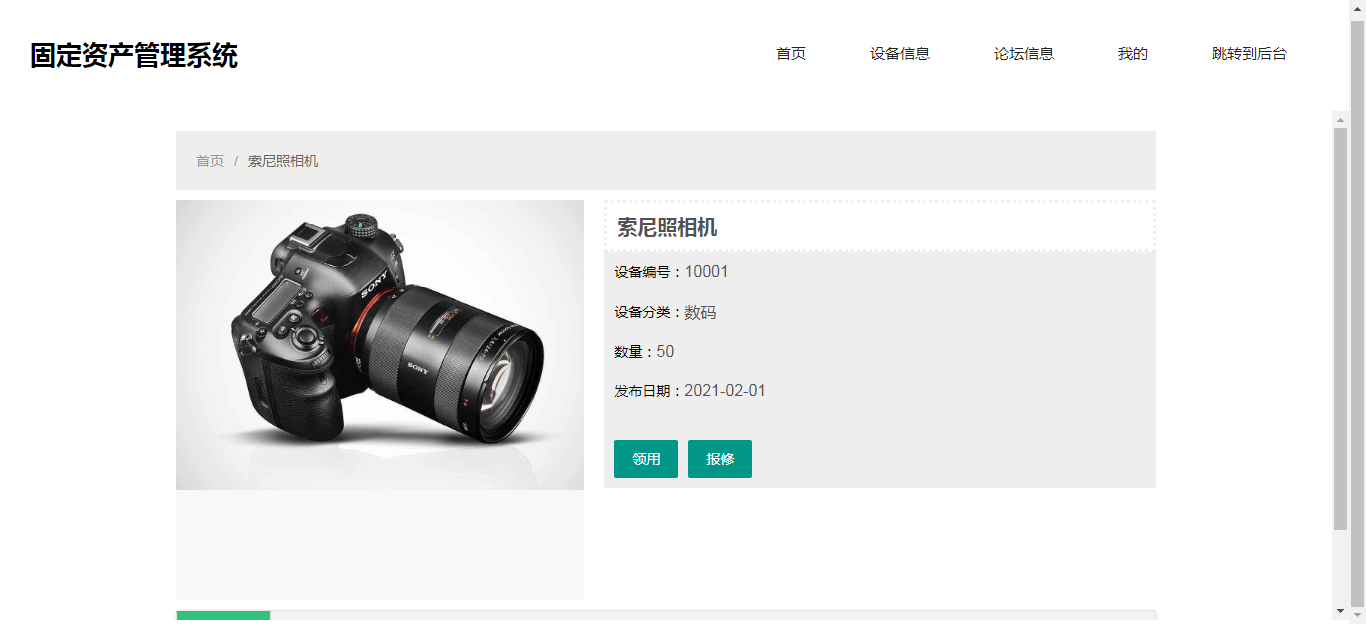 用户管理、系统公告管理、设备分类管理、设备信息管理、设备领用管理、